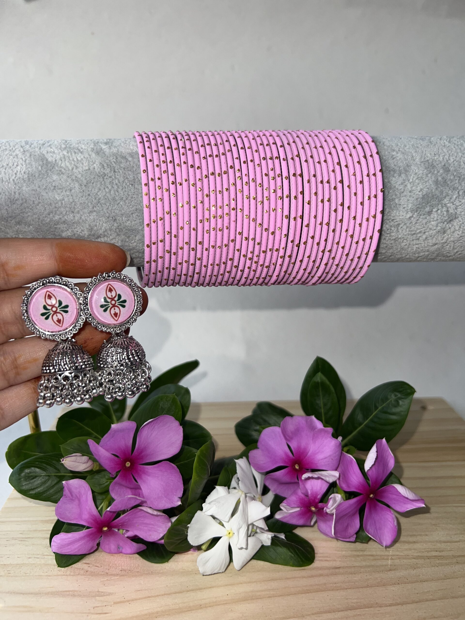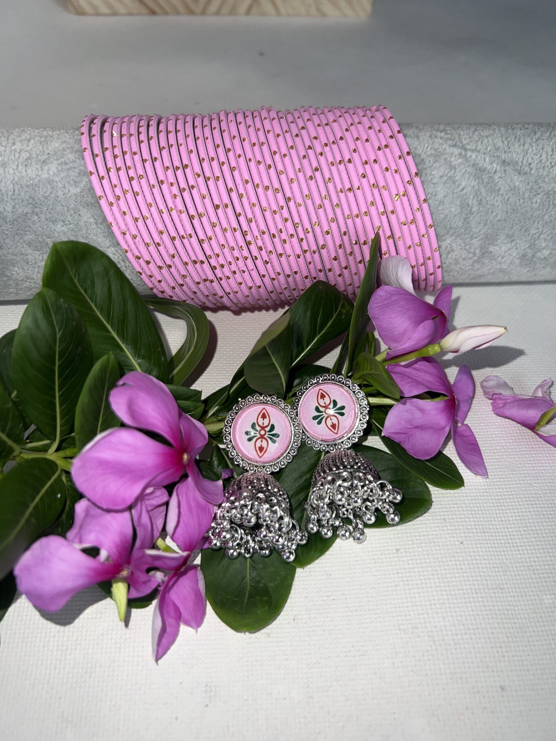 Pink oxidised jhumki earrings paired with a full stack of 3 dozen matching bangles – perfect for festive and wedding looks.