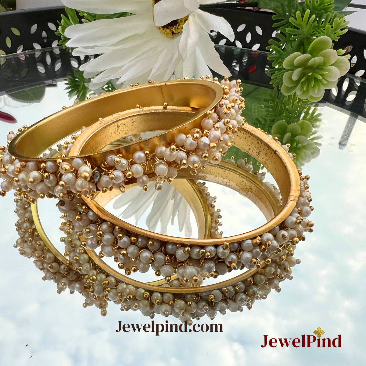 The White Pearl Gold Bangles by JewelPind blend timeless Punjabi grace with soft,. Each bangle is adorned with dainty faux pearls, delicately clustered over a gold-tone metal base  making it the ideal accessory for any wedding guest, bridesmaid, or festive ensemble.